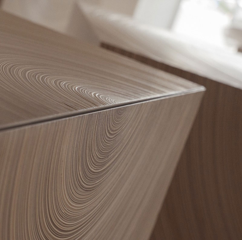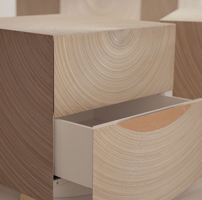 Inspired by seashells, these bedside tables, designed for a private yacht, evoke something intimate, like a refined chest containing precious items.