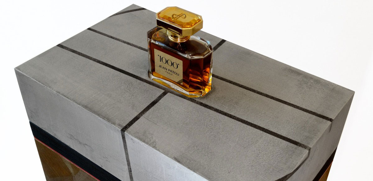 Jean Patou, couturier and manufacturer of luxury French perfumes, consulted premium decorator Ateliers Berger to design a modular base for the perfume "1000". This high-end furniture materializes olfactory sensations visually and tactilely: the pedestal becomes the perfume's ambassador, with a composition of wood, decorative coatings, Plexiglas and metal.