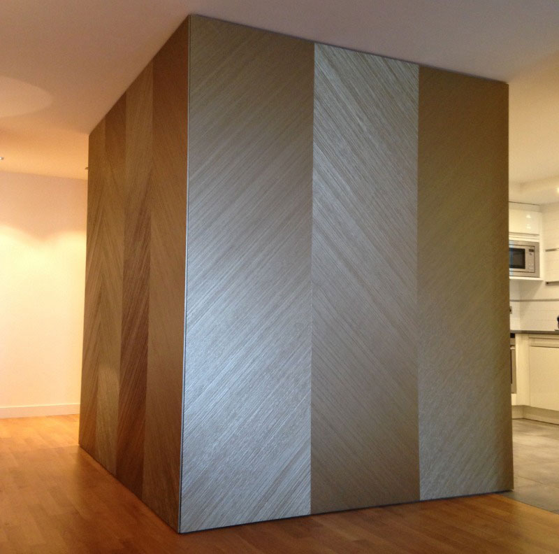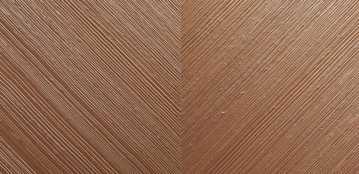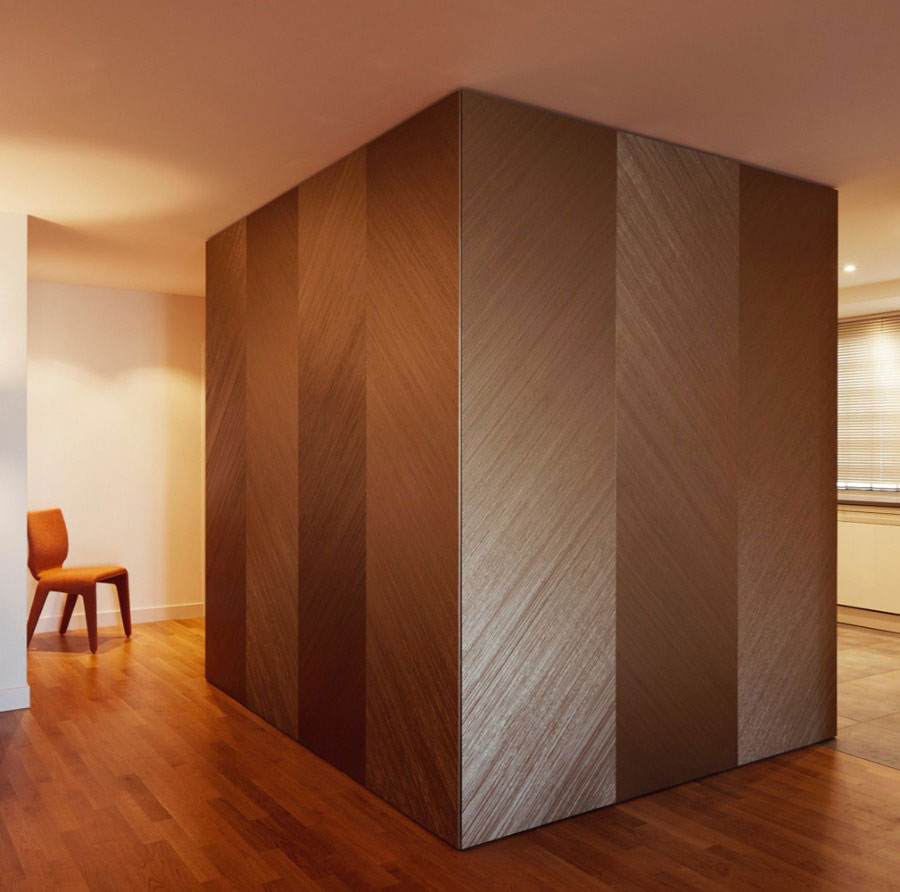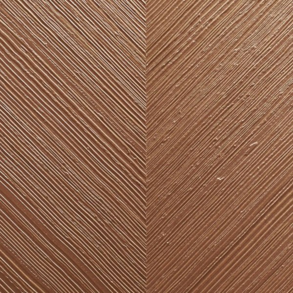 The paper was worked in marquetry with a lime coating to create a unique bronze-colored graphic composition. Each width was inlaid in a different way from the previous one to create an elegant rhythm and break in the joints.