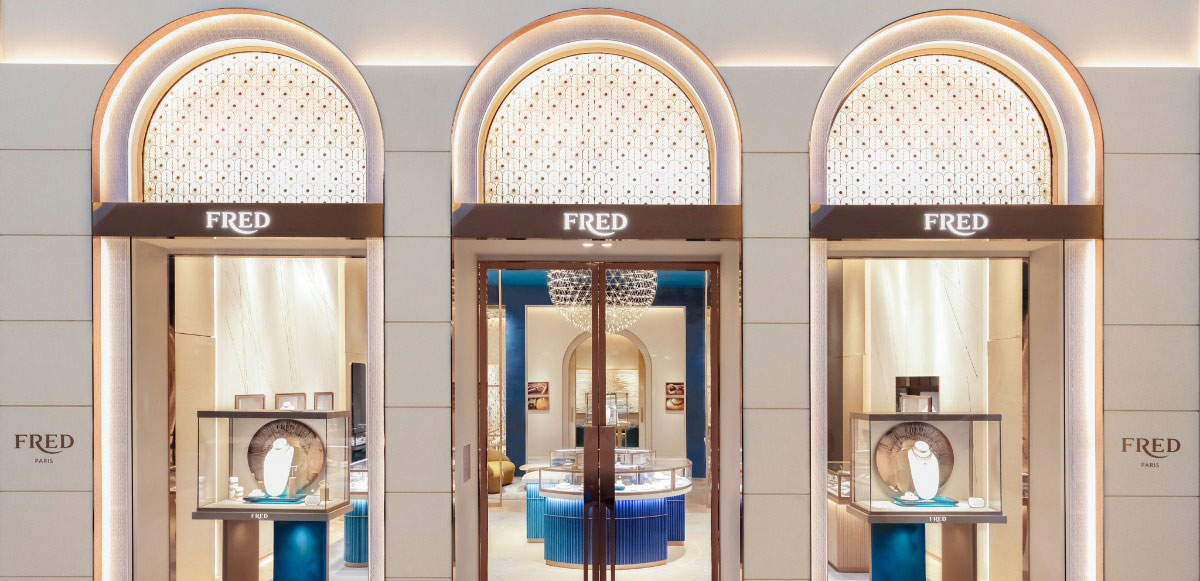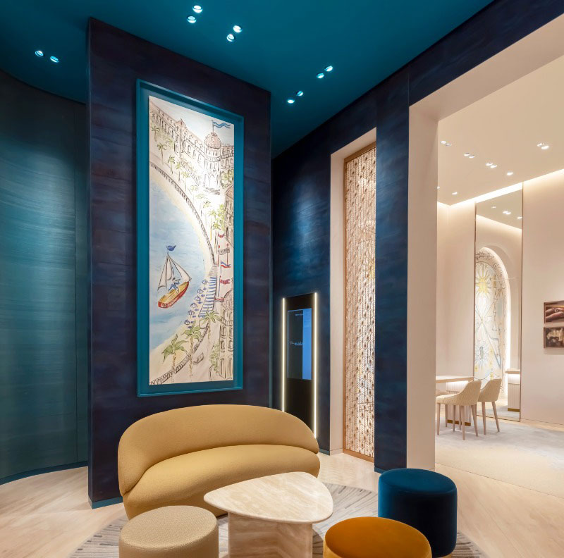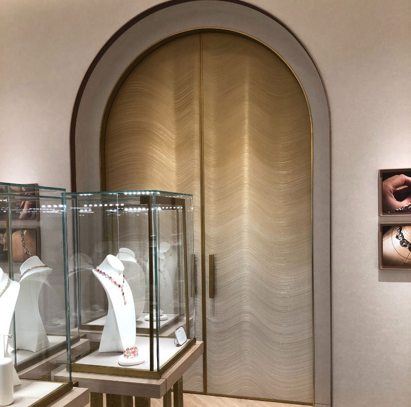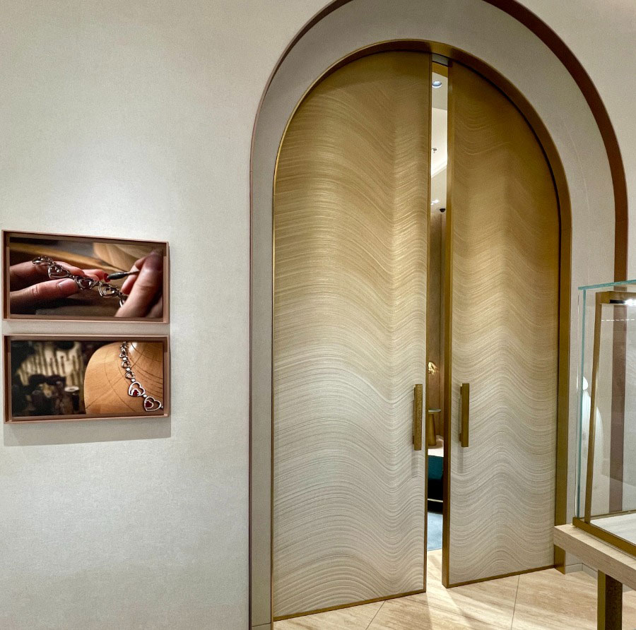 An exclusive creation of wall decors, but also door decors and exceptional furniture. In addition to the original design for the private lounges of the Maison Fred boutique in Dubai, particular attention was paid to materials to meet the durability requirements for intensive daily use of furniture and sliding doors.